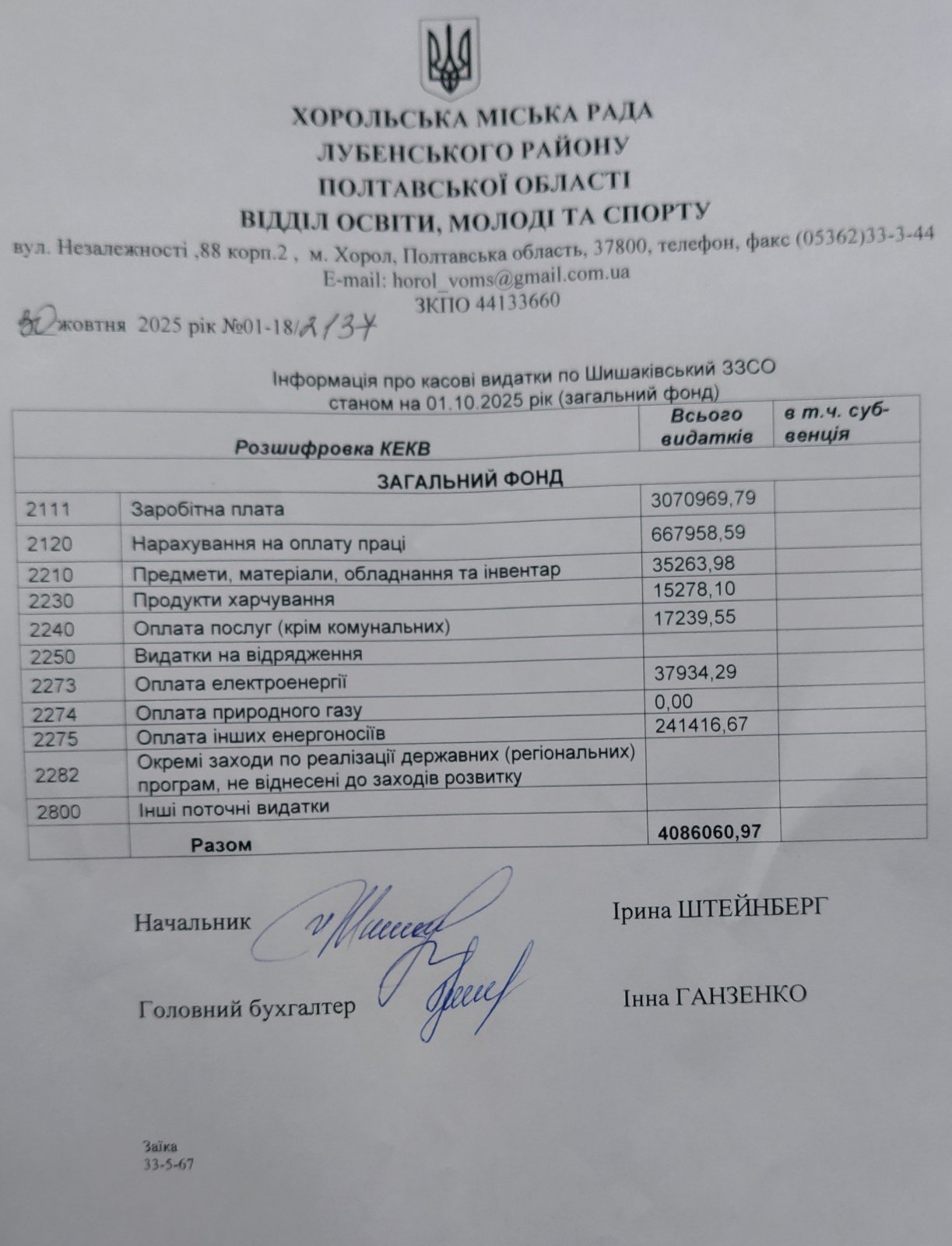 Інформація про касові видатки по Шишаківський ЗЗСО І-ІІІ станом на 01.10.2025 (загальний та спеціальний фонд )